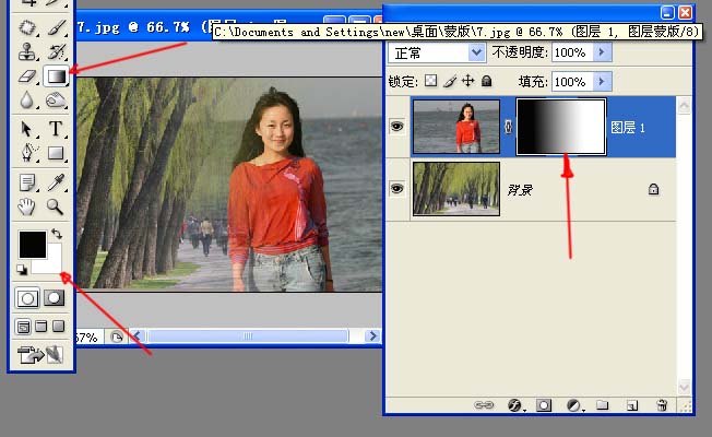 对人物层添加蒙版,拉出黑白渐变,黑色部分隐藏,白色部分显示,灰色部分过度,关键是用渐变后过度非常自然,这是我们用手涂抹弄不出来的效果。 |