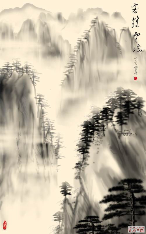 本教程的过程介绍有点简单,鼠绘的时候可能会复杂很多。山峰、树木、云雾等都需要先自己设置好笔刷后再慢慢绘制。