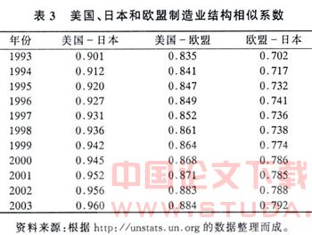 表3显示:从1993年到2002年,美国与日本的制造业结构相似系数在0.9~1.0之间波动,美国与欧盟的制造业结构相似系数在0.8~0.9之间波动,日本与欧盟的制造业结构相似系数则在0.7~0.8之间波动。而且通过观察可以发现,他们之间的制造业结构相似系数从1995年到2002年呈逐年上升趋势,可见美国、日本和欧盟制造业结构的确存在着高度的趋同。