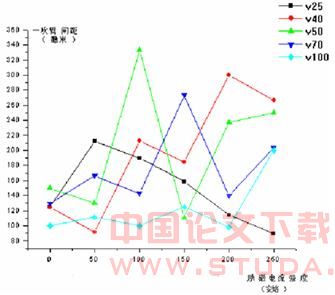 为 50A 时出现最大值,随后不断减小甚至出现小于未加磁场时的情况。随着牵引速度的增 大,参看 40、50、70、100µm/s 曲线,一次臂间距呈现出震荡增大现象,总体上看一次臂间 距随外磁场增大而不断增大,但增大过 程是反复波动的,每次出现极大值后必然仅随出现